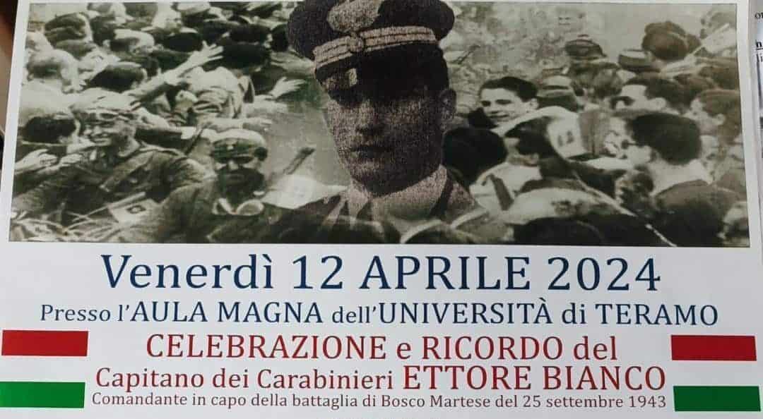 L’Associazione Nazionale Partigiani D’Italia (A.N.P.I.) della provincia di Teramo, nell’80° anniversario della Resistenza Italiana organizza con il Patrocinio del: Comune di Teramo, Provincia di Teramo, Università di Teramo, nella mattinata di venerdì 12 aprile prossimo venturo, presso l’Aula Magna di UniTe le celebrazioni e ricordo della figura del Capitano dei carabinieri Ettore Bianco, comandante in capo della Battaglia di Bosco Martese, nota come primo scontro in campo aperto tra forze partigiane e nazifascisti, avvenuto il 25 settembre del 1943.